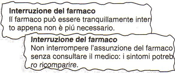 In caso di terapia protratta nel tempo, è importante sapere come e quando sospendere con sicurezza il medicinale. Alcuni farmaci possono essere senza rischio interrotti appena ci si sente meglio o appena i sintomi sono spariti. Per altri, l'assunzione non deve essere interrotta finché la terapia non è stata completata, o deve essere sospesa gradualmente sotto controllo medico. Smettere senza seguire le istruzioni del medico può causare effetti sfavorevoli, può far peggiorare le condizioni o far riapparire i sintomi. Sull'argomento, vedi anche come interrompere un trattamento farmacologico.